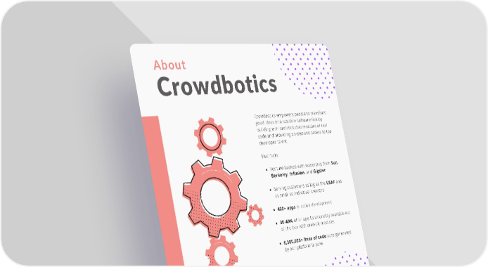 About Crowdbotics Crowdbotics empowers people to transform good ideas into scalable software fast by building with prefabricated modules of real code and providing on-demand access to top developer talent. Fast facts: Venture-backed with leadership from Sun, Berkeley, Infusion, and Gigster Serving customers as big as the USAF and as small as individual creators 400+ apps in active development 30-40% of all app functionality available out of the box with prebuilt modules 6,000,000+ lines of code auto-generated by our platform in June Ready to build? Talk To An Expert Today 15