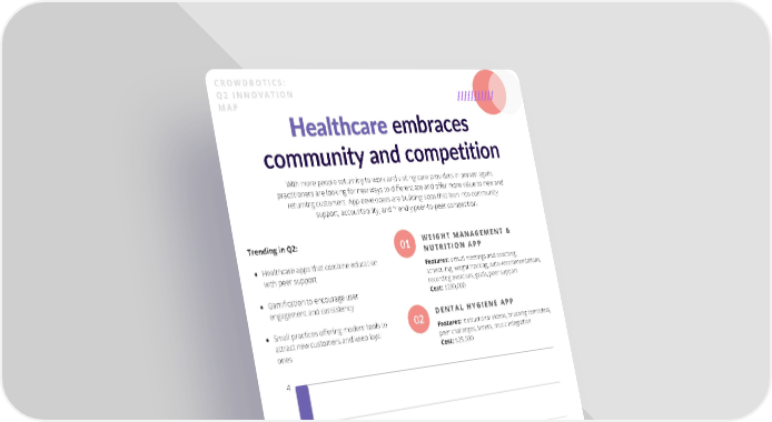 CROWDBOTICS: Q2 INNOVATION MAP Healthcare embraces community and competition With more people returning to work and visiting care providers in person again, practitioners are looking for new ways to differentiate and offer more value to new and returning customers. App developers are building apps that lean into community support, accountability, and friendly peer-to-peer competition. Trending in Q2: WEIGHT MANAGEMENT & WEIGHT MANAGEMENT & 01 NUTRITION APP NUTRITION APP Healthcare apps that combine education Features: virtual meetings and coaching, with peer support scheduling, weight tracking, auto-recommendations, recording exercises, goals, peer support Gamification to encourage user Cost: $200,000 engagement and consistency DENTAL HYGIENE APP DENTAL HYGIENE APP Small practices offering modern tools to 02 Features: instructional videos, brushing reminders, attract new customers and keep loyal peer challenges, timers, music integration ones Cost: $25,000 4 3 2 1 0 I r r r r g y s g n e e o n e e M P r m r e a e e r c e n o e o n i i i t i R A o g k m a e u n d n t d t t r t t c h i a a o C n n h a a a c a s c p a V n s a e G N y c z e l l r h a i a i m e a l r S T S P r a i o n C a d i l o M C s C u D n f u a a s R t r s e e m e i l e a e i e V n r F M P m D t i c a o t F S C a D 9
