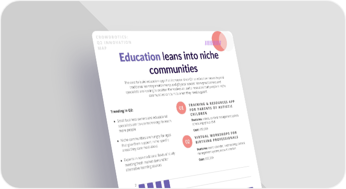 CROWDBOTICS: Q2 INNOVATION MAP Education leans into niche communities The cost to build education apps has increased since Q1 as education moves beyond traditional learning environments and physical spaces. More practitioners and specialists are looking to position themselves as useful resources that people in niche communities can turn to when they need support. Trending in Q2: TRAINING & RESOURCES APP TRAINING & RESOURCES APP 01 FOR PARENTS OF AUTISTIC FOR PARENTS OF AUTISTIC Small business owners and educational CHILDREN CHILDREN specialists aim to use technology to reach Features: videos, content management system, more people scheduling, group chat Cost: $50,000 Niche communities are hungry for apps that give them support in the specific VIRTUAL WORKSHOPS FOR VIRTUAL WORKSHOPS FOR areas they care most about 02 BIRTHING PROFESSIONALS BIRTHING PROFESSIONALS Features: event calendar, livestreaming, content Experts in non-traditional fields of study management system, account creation meeting fresh market demand for alternative learning sources Cost: $35,300 2 1.5 1 0.5 0 t t r t t r y g k y e e n e n r t r n n t r e n n a i i n o o i i y i o e m e o v e e u s d t t i t t t a h a i t n b w l c a m n c m m p t c n t G e t e e P a e l a o e u g r m s n i g a i r o a C C W o d i e N a o C D o C c v l o a d f n t p r e a n e n i I a a p I P R c l M A M D o h a t S c n n e o e e s r p m e S u P c o D 7