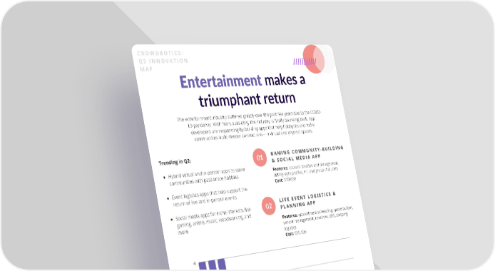 CROWDBOTICS: Q2 INNOVATION MAP Entertainment makes a triumphant return The entertainment industry suffered greatly over the past few years due to the COVID- 19 pandemic. With fears subsiding, the industry is finally bouncing back. App developers are responding by building apps that help hobbyists and niche communities build deeper connections—in virtual and physical spaces. Trending in Q2: GAMING COMMUNITY-BUILDING GAMING COMMUNITY-BUILDING 01 & SOCIAL MEDIA APP & SOCIAL MEDIA APP Hybrid virtual and in-person apps to serve Features: account creation and management, communities with passionate hobbies dating-style profiles, 1-1 and group chat, CMS Cost: $70,000 Event logistics apps that help support the return of live and in-person events LIVE EVENT LOGISTICS & LIVE EVENT LOGISTICS & Social media apps for niche interests, like 02 PLANNING APP PLANNING APP gaming, anime, music, woodworking, and Features: appointment scheduling, quote builder, more vendor management, timelines, GPS, shipping logistics Cost: $50,000 4 3 2 1 0 I r r t t g k y y g t e e n n e e e r P r r a e e r n c c c n l o o n n i y i i e i o r A o e m h u t n n u e t t t r t v a e v a t i C a l w e a a a l c a d t p E n g r G P c e D e m e e h i i a m e l r o o l i r S a h n n C D i i N m C b c e l o u D l t f o d o a a S n l t r a l e e n C i I m t - a O e o d c i n M E s P m D o C e V s o S e m C t n i n s i u o B p p A 12