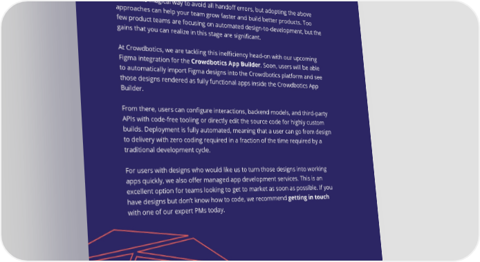 Ch. 5 - How Teams Can Get to Market 4x Faster with Automated Design-to-Development Wrapping Up There is no magical way to avoid all handoff errors, but adopting the above approaches can help your team grow faster and build better products. Too few product teams are focusing on automated design-to-development, but the gains that you can realize in this stage are significant. At Crowdbotics, we are tackling this inefficiency head-on with our upcoming Figma integration for the Crowdbotics App Builder. Soon, users will be able to automatically import Figma designs into the Crowdbotics platform and see those designs rendered as fully functional apps inside the Crowdbotics App Builder. From there, users can configure interactions, backend models, and third-party APIs with code-free tooling or directly edit the source code for highly custom builds. Deployment is fully automated, meaning that a user can go from design to delivery with zero coding required in a fraction of the time required by a traditional development cycle. For users with designs who would like us to turn those designs into working apps quickly, we also offer managed app development services. This is an excellent option for teams looking to get to market as soon as possible. If you have designs but don’t know how to code, we recommend getting in touch with one of our expert PMs today. 40