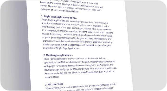 Ch. 2 - How to Choose the Best Architecture for Your Web Application Types Of Web Application Architecture We classify the different types of web application architectures based on the way the app logic is distributed between the client and server. The most common types of web architectures, along with examples of each, can be found below: 1. Single page applications (SPAs) – Single Page Applications are increasingly popular due to their minimalist layout and architectural structure. SPA architecture is organized in such a way that only part of the page content gets updated when a user moves on to a new page, so there’s no need to reload the same components. This alone makes it extremely convenient for both developers and users alike! Utilizing popular JavaScript frameworks like Angular and React, developers use SPA architecture to deliver a unique and interactive user experience by allowing single-page apps. Gmail, Google Maps, and Facebook are just a few great examples of Single Page Applications. 2. Multi-page applications – Multi-Page applications are very common on the web since all web applications used MPA architecture in the past. This architecture type reloads web pages for sending from/to the server through the user’s browser, and developers generally opt for MPA architecture if the application is pretty large. Amazon and eBay are two of the most well-known multi-page applications around today. 3. Microservices – Microservices are a kind of service-oriented architecture (SOA) used to build distributed software systems. With this style of architecture, developers build web apps using a collection of loosely coupled services that can be independently deployed. In turn, this functionality fragmentation makes it easier to build, expand, and scale an application. Some well-known projects with Microservices architecture are Netflix, Uber, Spotify, and PayPal. 12