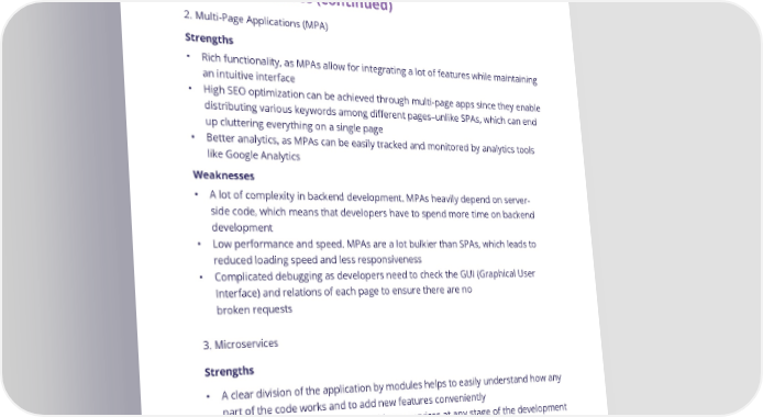 Ch. 2 - How to Choose the Best Architecture for Your Web Application Strengths and Weaknesses of Different App Architectures (continued) 2. Multi-Page Applications (MPA) Strengths • Rich functionality, as MPAs allow for integrating a lot of features while maintaining an intuitive interface • High SEO optimization can be achieved through multi-page apps since they enable distributing various keywords among different pages–unlike SPAs, which can end up cluttering everything on a single page • Better analytics, as MPAs can be easily tracked and monitored by analytics tools like Google Analytics Weaknesses • A lot of complexity in backend development. MPAs heavily depend on server- side code, which means that developers have to spend more time on backend development • Low performance and speed. MPAs are a lot bulkier than SPAs, which leads to reduced loading speed and less responsiveness • Complicated debugging as developers need to check the GUI (Graphical User Interface) and relations of each page to ensure there are no broken requests 3. Microservices Strengths • A clear division of the application by modules helps to easily understand how any part of the code works and to add new features conveniently • High scalability. Developers can add new services at any stage of the development process without altering the entire architecture • High availability. The application will continue to work even if non-critical services break • Ability to select a variety of tools and technologies when developing each service • Ease of deployment compared to other architectures since services are independent of each other 14