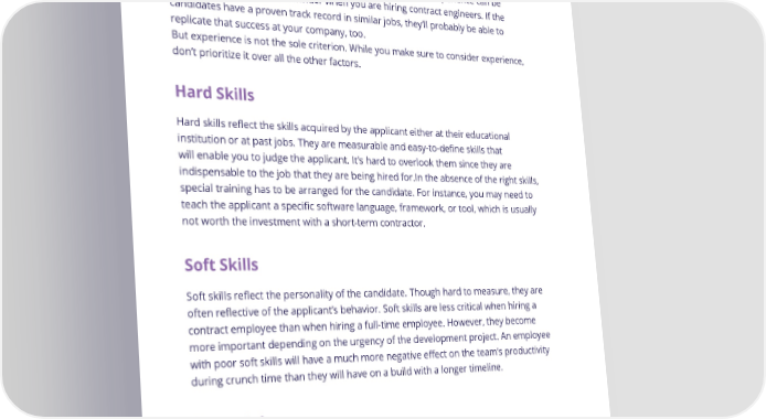 Job Experience When you have to choose between two candidates, one with experience and one without, it is obviously prudent to opt for the former, especially if you are on a shoestring budget and have no time to train new employees. Experience can be a differentiating factor to consider when you are hiring contract engineers. If the candidates have a proven track record in similar jobs, they’ll probably be able to replicate that success at your company, too. But experience is not the sole criterion. While you make sure to consider experience, don’t prioritize it over all the other factors. Hard Skills Hard skills reflect the skills acquired by the applicant either at their educational institution or at past jobs. They are measurable and easy-to-define skills that will enable you to judge the applicant. It’s hard to overlook them since they are indispensable to the job that they are being hired for.In the absence of the right skills, special training has to be arranged for the candidate. For instance, you may need to teach the applicant a specific software language, framework, or tool, which is usually not worth the investment with a short-term contractor. Soft Skills Soft skills reflect the personality of the candidate. Though hard to measure, they are often reflective of the applicant’s behavior. Soft skills are less critical when hiring a contract employee than when hiring a full-time employee. However, they become more important depending on the urgency of the development project. An employee with poor soft skills will have a much more negative effect on the team’s productivity during crunch time than they will have on a build with a longer timeline. Potential An experienced interviewer often spots candidates who may not have adequate experience, but possess good educational credibility and potential. For such promising candidates, sometimes it pays to take a chance by hiring them as they might grow into top performers. 21