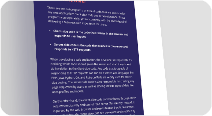 How Does Web Application Architecture Work? There are two subprograms, or sets of code, that are common for any web application: client-side code and server-side code. These programs run separately, yet concurrently, with the shared goal of delivering a seamless web experience for users. • Client-side code is the code that resides in the browser and responds to user inputs • Server-side code is the code that resides in the server and responds to HTTP requests When developing a web application, the developer is responsible for deciding which code should go on the server and what they should do in relation to the client-side code. Any code that is capable of responding to HTTP requests can run on a server, and languages like PHP, Java, Python, C#, and Ruby on Rails are widely used for server- side coding. The server-side code is also responsible for creating any page requested by users as well as storing various types of data like user-profiles and inputs. On the other hand, the client-side code communicates through HTTP requests exclusively and cannot read server files directly. Instead, it is parsed by the web browser and reacts to user inputs. In contrast to server-side code, client-side code can be viewed and modified by the user, and a combination of HTML, CSS, and JavaScript is utilized to build pages and content. 11