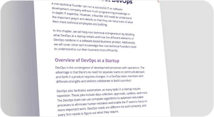 Ch. 4 What Every Non-Technical Founder Should Know About DevOps A non-technical founder can run a successful IT or software development company without much programming knowledge or in-depth IT expertise. However, a founder still needs to understand the important jargon and details so that they can keep track of what their more technical employees are building. In this chapter, we will help non-technical entrepreneurs by detailing what DevOps at a startup entails and how the different elements of DevOps combine in a software-based business product. Additionally, we will cover other tech knowledge that non-technical founders need to understand to run their business more efficiently. Overview of DevOps at a Startup DevOps is the convergence of development processes with operations. The advantage is that there’s no need for separate teams to communicate back and forth if a product requires changes. In a DevOps team, members with different strengths and skillsets collaborate to build a product. DevOps also facilitates automation, as many tasks in a startup require repetition. These jobs include data collection, approvals, updates, and more. The DevOps team can use computer algorithms to automate redundant processes to eliminate human mistakes and enable the IT team to focus on more important work. DevOps needs are different for each company, and every firm needs to figure out what they require. 26