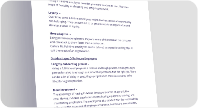 Ch. 3 - Key Factors To Consider When Hiring Contract Engineers Advantages Of Hiring In-House Employees Scope of flexibility – Having a full-time employee provides you more freedom to plan. There is a scope of flexibility in allocating and assigning the work. Loyalty – Over time, some full-time employees might develop a sense of responsibility and belonging. They can turn out to be great assets to an organization and develop a sense of loyalty. More adaptive – Being permanent employees, they are aware of the needs of the company and can adapt to them faster than a contractor. Culture Fit: Full-time employees can be tailored to a specific working style to suit the needs of an organization. Disadvantages Of In-House Employees Lengthy onboarding process – Hiring a full-time employee is a tedious and tough process. Finding the right person for a job is as tough as it is for that person to find the right job. There can be a lot of delay in executing a project when there is a vacancy to be filled for a given position. More investment – The advantage of having in-house developers comes at a prohibitive cost. Having in-house developers means buying equipment, training, and maintaining employees. The employer is also saddled with the responsibility of bearing the expenses of employee insurance, health care, annual raises, and other incidental costs. Lack of exposure – Having been confined to the routine of office work, an in-house employee may lack the vision to execute a task dynamically. Due to limited exposure, in-house employees may also not be acquainted with trending technologies. 24