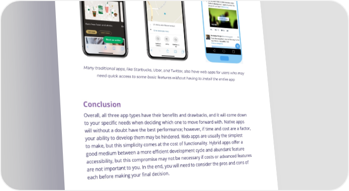 Many traditional apps, like Starbucks, Uber, and Twitter, also have web apps for users who may need quick access to some basic features without having to install the entire app Conclusion Overall, all three app types have their benefits and drawbacks, and it will come down to your specific needs when deciding which one to move forward with. Native apps will without a doubt have the best performance; however, if time and cost are a factor, your ability to develop them may be hindered. Web apps are usually the simplest to make, but this simplicity comes at the cost of functionality. Hybrid apps offer a good medium between a more efficient development cycle and abundant feature accessibility, but this compromise may not be necessary if costs or advanced features are not important to you. In the end, you will need to consider the pros and cons of each before making your final decision. 9