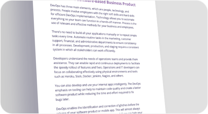 Ch. 4 - What Every Non-Technical Founder Should Know About DevOps How the Different Components of DevOps Tie Together in a Software-Based Business Product DevOps has three main elements, which are people, technology, and process. People involve employees with the right soft skills and hard skills for efficient DevOps implementation. Technology allows you to automate everything so your team can function in a hands-off manner. Process is the use of relevant and effective methods for your business and employees. There’s no need to build all your applications manually or to repeat simple tasks every time. Automate routine tasks in the marketing, customer support, financial, and administrative departments to ensure consistency in all processes. Development, production, and staging require a consistent system in which all stakeholders can work efficiently. Developers understand the needs of operations teams and provide them assistance. They can enable rapid and continuous deployments to facilitate the speedy rollout of features and fixes. Operations and IT developers can focus on collaborating effectively using physical environments and tools such as Heroku, Slack, Docker, Jenkins, Nagios, and others. You can also develop and use your internal apps intelligently. The DevOps emphasis on tooling can help to maintain code quality and create a better software product while reducing the time and effort required to fix bugs later. DevOps enables the identification and correction of glitches before the release of your software product or mobile app. This will almost always lead to higher user satisfaction scores. Continuous delivery can help your developers release customer-facing apps more rapidly. 28