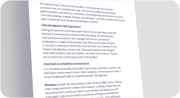 Automating the Design-to-Development Handoff Companies need to adopt some carefully chosen ways to alleviate the above- mentioned challenges during handoff. The optimal way to structure this handoff is to incorporate tech tools and processes that can automate key steps, like providing interactive prototypes, gathering teams and assets on one board, and maintaining documentation to avoid misunderstandings between designer and developer. Let’s take a deeper look at some ways to automate your design-to-development handoff: Task management and organization Getting all teams on one project board from the very beginning is essential because it automates the overall workflow for design and development. Asana and Jira are popular task management tools for grouping all employees in a single communication loop.These tools enable everyone to see who is working on which task, and it provides total visibility into the content and objectives of each task. They automatically create a project board with timelines, task prioritization, and team-level tracking. They also act as a home for all necessary assets of the project. Cloud tools to streamline communication It is sometimes physically impossible to get all team members to work in the same place and be aware of each other’s progress. One best practice here is to use cloud-based tools to streamline product management. Mockplus provides the functionality to edit and share PRDs online, offering faster design and better collaboration features. It displays design files and documents from a bird’s-eye view for each product and allows one-click downloads. It also has the ability to accelerate a design-to-development handoff by generating historical versions of source files, which eliminates traditional ways of archiving files and data Google Drive and Dropbox can also be adopted to make assets accessible to each team on the cloud, although they also present a risk of over- documentation if not properly organized. 35