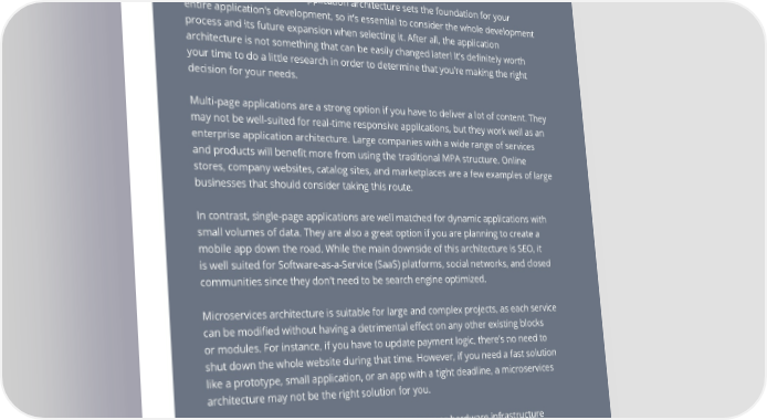 Ch. 2 - How to Choose the Best Architecture for Your Web Application How to Choose the Right Architecture For Your Project Choosing the appropriate application architecture sets the foundation for your entire application’s development, so it’s essential to consider the whole development process and its future expansion when selecting it. After all, the application architecture is not something that can be easily changed later! It’s definitely worth your time to do a little research in order to determine that you’re making the right decision for your needs. Multi-page applications are a strong option if you have to deliver a lot of content. They may not be well-suited for real-time responsive applications, but they work well as an enterprise application architecture. Large companies with a wide range of services and products will benefit more from using the traditional MPA structure. Online stores, company websites, catalog sites, and marketplaces are a few examples of large businesses that should consider taking this route. In contrast, single-page applications are well matched for dynamic applications with small volumes of data. They are also a great option if you are planning to create a mobile app down the road. While the main downside of this architecture is SEO, it is well suited for Software-as-a-Service (SaaS) platforms, social networks, and closed communities since they don’t need to be search engine optimized. Microservices architecture is suitable for large and complex projects, as each service can be modified without having a detrimental effect on any other existing blocks or modules. For instance, if you have to update payment logic, there’s no need to shut down the whole website during that time. However, if you need a fast solution like a prototype, small application, or an app with a tight deadline, a microservices architecture may not be the right solution for you. If you don’t want to manage or support the servers or hardware infrastructure required for the application, a serverless architecture is going to be your best bet. If you want maximum scalability and performance across all platforms, RAD stack is the way to go. Rather than being specialized for a few niche use cases, RAD is built to support a huge range of business types and app requirements. 16