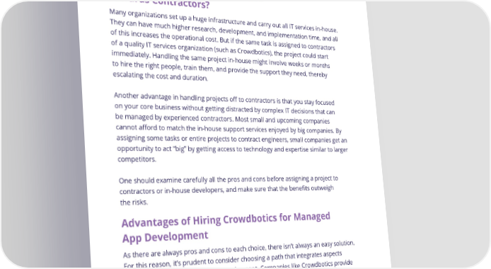 Work at ease – As there is a flexibility of working hours, manner of work, and interdependence between co-workers, there is often delay in executing projects. What Types Of Projects Are Geared Towards Contractors? Many organizations set up a huge infrastructure and carry out all IT services in-house. They can have much higher research, development, and implementation time, and all of this increases the operational cost. But if the same task is assigned to contractors of a quality IT services organization (such as Crowdbotics), the project could start immediately. Handling the same project in-house might involve weeks or months to hire the right people, train them, and provide the support they need, thereby escalating the cost and duration. Another advantage in handling projects off to contractors is that you stay focused on your core business without getting distracted by complex IT decisions that can be managed by experienced contractors. Most small and upcoming companies cannot afford to match the in-house support services enjoyed by big companies. By assigning some tasks or entire projects to contract engineers, small companies get an opportunity to act “big” by getting access to technology and expertise similar to larger competitors. One should examine carefully all the pros and cons before assigning a project to contractors or in-house developers, and make sure that the benefits outweigh the risks. Advantages of Hiring Crowdbotics for Managed App Development As there are always pros and cons to each choice, there isn’t always an easy solution. For this reason, it’s prudent to consider choosing a path that integrates aspects from both contract and full-time employment. Companies like Crowdbotics provide contracted, high-quality skilled engineers with proven track records. Crowdbotics focuses on hiring remote resources that operate within the client’s time zone, possess verified language skills, and are compatible with the client’s work culture. Crowdbotics utilizes a flexible, single contract that enables clients to build virtual teams that adapt to every need in the project life cycle. 25