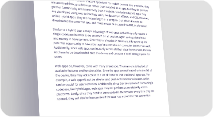 Ch. 1 - A Simple Guide to Native, Hybrid, and Web Apps Web Applications Web apps are just websites that are optimized for mobile devices. Like a website, they are accessed through a browser rather than installed as an app, but they do provide greater functionality and interactivity than a website. Similarly to hybrid apps, they are developed using web technology tools, like Javascript, HTML5, and CSS. However, unlike hybrid apps, they are not packaged in a wrapper that allows them to be downloaded like a normal app, and must always be accessed via URL in a browser. Similar to a hybrid app, a major advantage of web apps is that they only require a single codebase in order to be accessed on all devices, again saving a lot of time and money in development. Since they are loaded in browsers, this opens up the potential opportunity to have your app be accessible on computer browsers as well. Additionally, since web apps continuously access all their data from servers, they do not have to be downloaded onto the device and can save a lot of storage space for users. Web apps do, however, come with many drawbacks. The main one is the lack of available features and functionalities. Since the apps are not loaded onto the OS of the device, they may lack access to a lot of features that traditional apps use. For example, a web app will not be able to send push notifications to its user, which can be crucial for user retention. Additionally, since they are spawned from a single codebase, like hybrid apps, web apps may not perform as consistently across platforms. Lastly, since they need to be reloaded in the browser every time they are opened, they will also be inaccessible if the user has a poor internet connection. 8