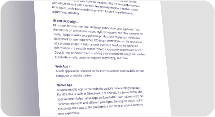 Ch. 4 - What Every Non-Technical Founder Should Know About DevOps Frontend/Backend – Each app has a frontend and backend. The backend accepts user entries, stores them, and gets data from the database. The frontend is the interface with which the end-user interacts. Frontend development involves design techniques, while backend development is focused on performance, algorithms, and data. UI and UX Design – UI is short for user interface. UI design dictates how your app looks. Thus, the focus is on animations, colors, style, typography, and other elements. UI design helps to make your software product look engaging and beautiful. UX is short for user experience. UX design concentrates on the ease of use of a product or app. It helps answer questions like does the app layout information in a sensible manner? Does it expectedly react to user input? Does it help or hinder them in solving their problem? UX design also involves automatic emails, customer support, copywriting, and more. Web App – A web application is hosted on the internet and not downloadable on your computer or mobile device. Native App – A native mobile app is created in the device’s native coding language. For iOS, this is Swift or Objective-C. For Android, it is Java or Kotlin. This specialization helps native apps perform better. Each native system has common elements and different paradigms. Developers should look to customize their app to the platform it is run on, to produce a cohesive user experience. 30