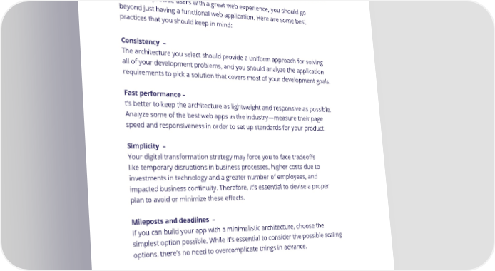 Ch. 2 - How to Choose the Best Architecture for Your Web Application Best Practices For Web Application Architecture In order to provide users with a great web experience, you should go beyond just having a functional web application. Here are some best practices that you should keep in mind: Consistency – The architecture you select should provide a uniform approach for solving all of your development problems, and you should analyze the application requirements to pick a solution that covers most of your development goals. Fast performance – t’s better to keep the architecture as lightweight and responsive as possible. Analyze some of the best web apps in the industry—measure their page speed and responsiveness in order to set up standards for your product. Simplicity – Your digital transformation strategy may force you to face tradeoffs like temporary disruptions in business processes, higher costs due to investments in technology and a greater number of employees, and impacted business continuity. Therefore, it’s essential to devise a proper plan to avoid or minimize these effects. Mileposts and deadlines – If you can build your app with a minimalistic architecture, choose the simplest option possible. While it’s essential to consider the possible scaling options, there’s no need to overcomplicate things in advance. 18
